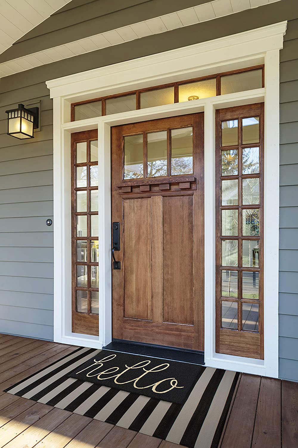 Love these Hello Doormats with layered striped rug.